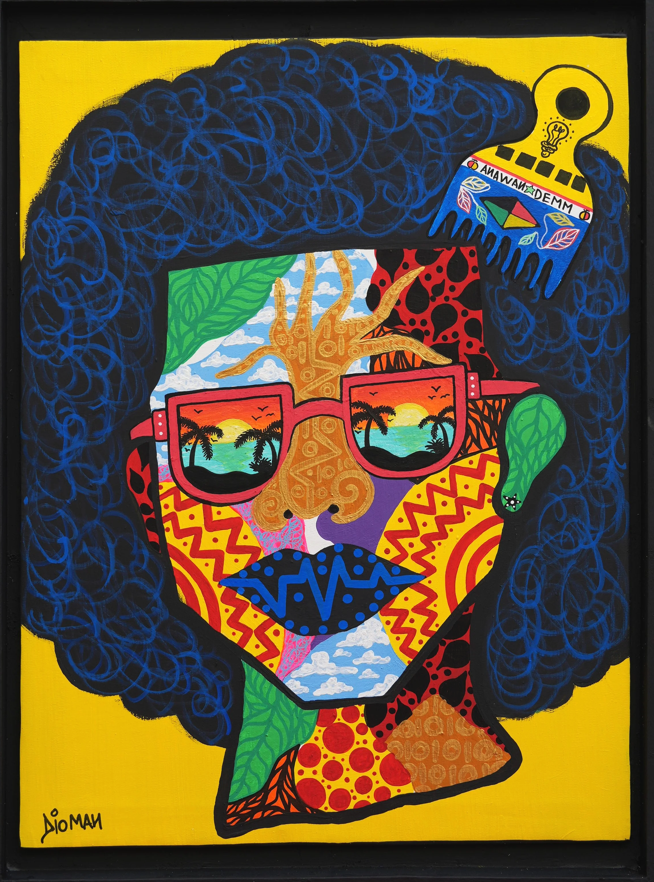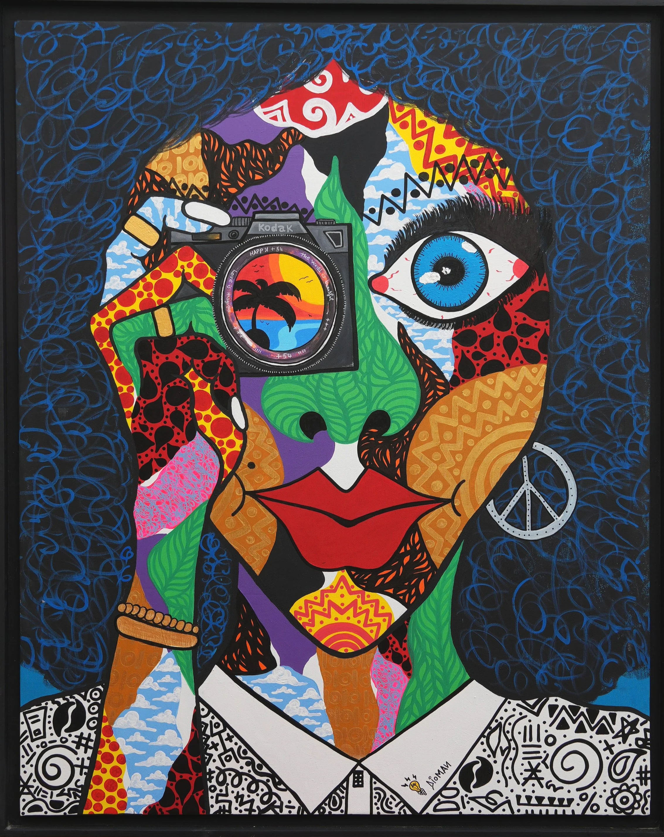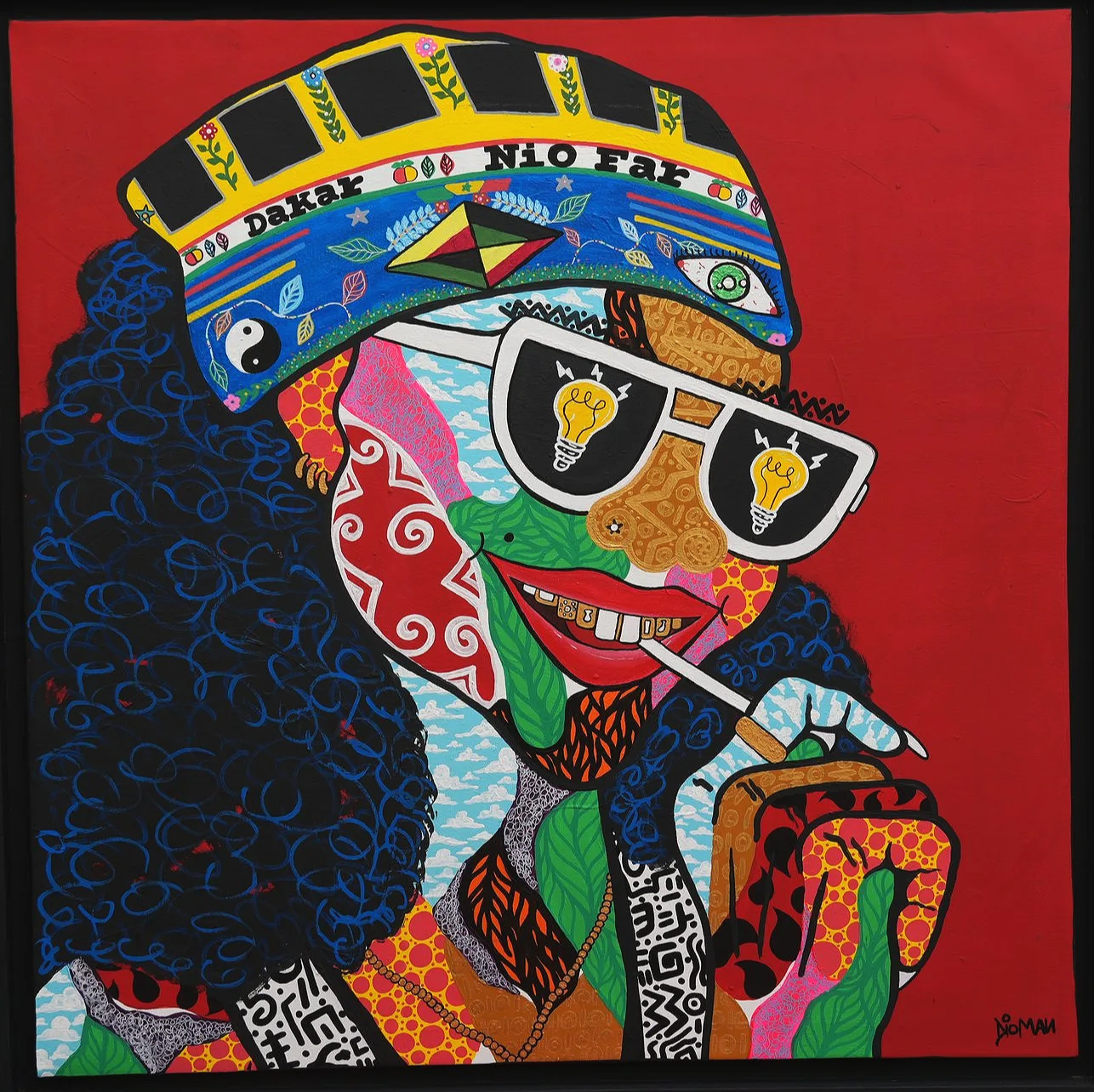 His works convey the positive energies of the colors of life. Optimistic by nature and with a touch of madness, he advocates “begué” (joy of life in Wolof), despite the obstacles one may encounter. He draws his inspiration from a childhood in Dakar filled with colors and flavors. Everything is movement and harmony in his eyes: in urban Dakar, with its streets scented with touba coffee, colorful and bustling with fast buses and gerté (peanut) sellers, as well as in nature, where he recharges his batteries. A light bulb is present in each of his paintings, representing light and positive energy.