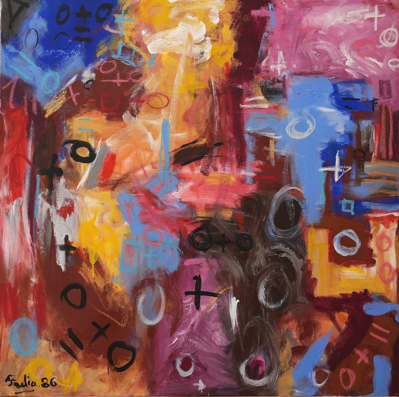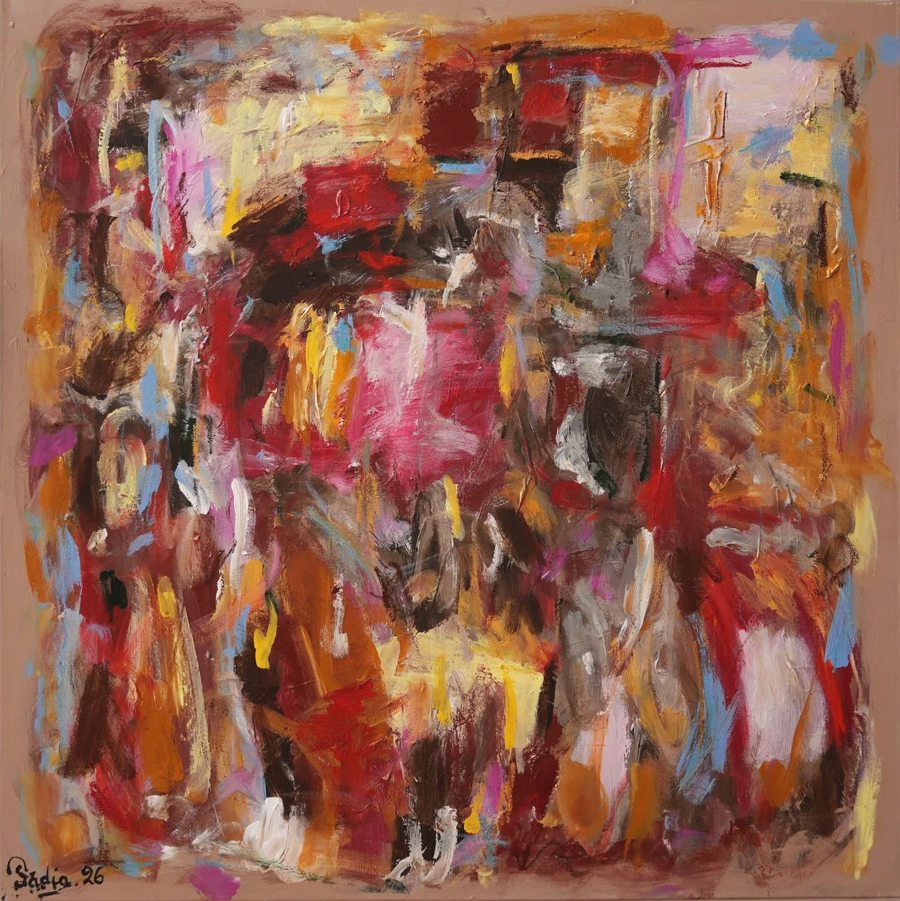 Acrylic on canvas, palette knife, oil pastel, 100cm x 100cm