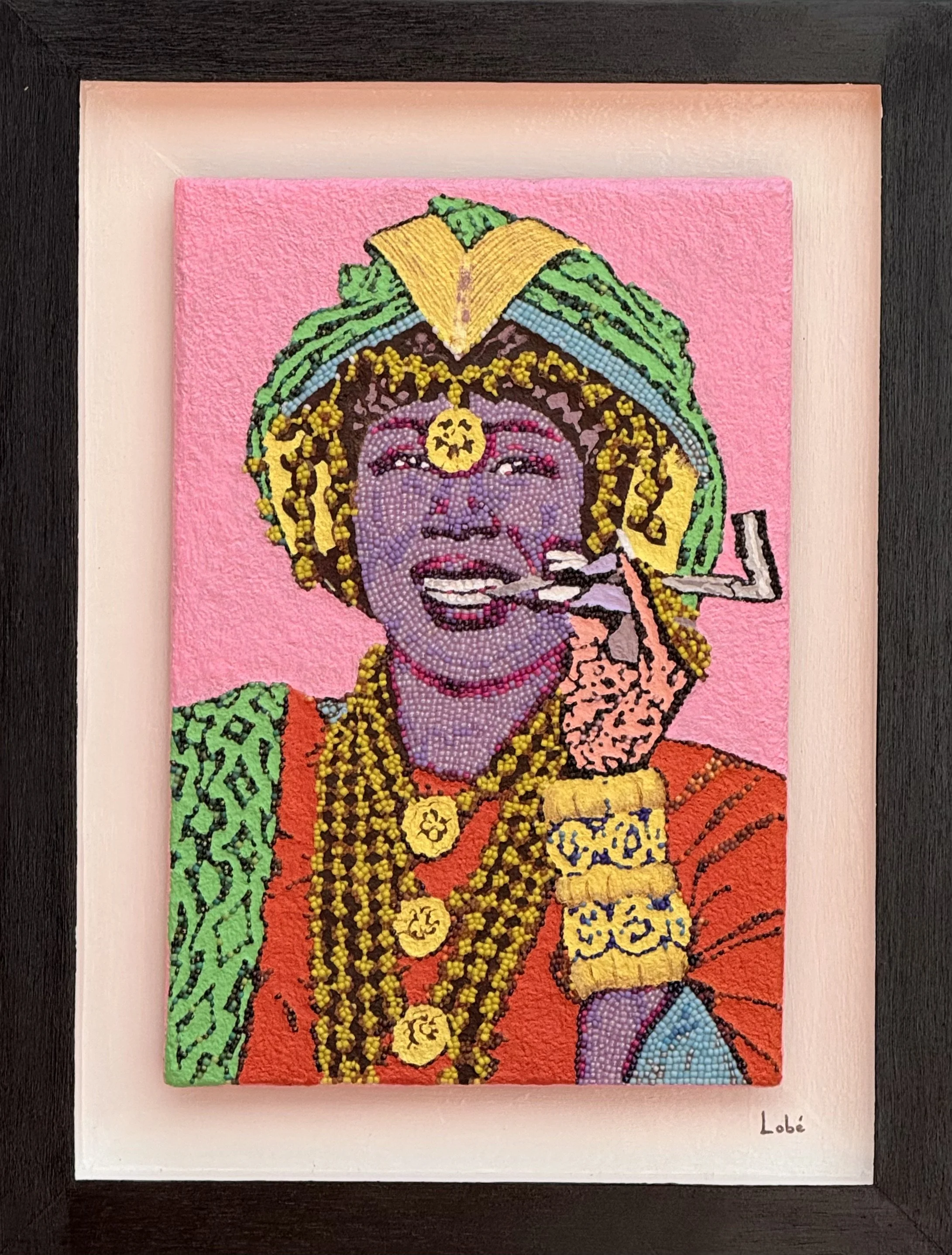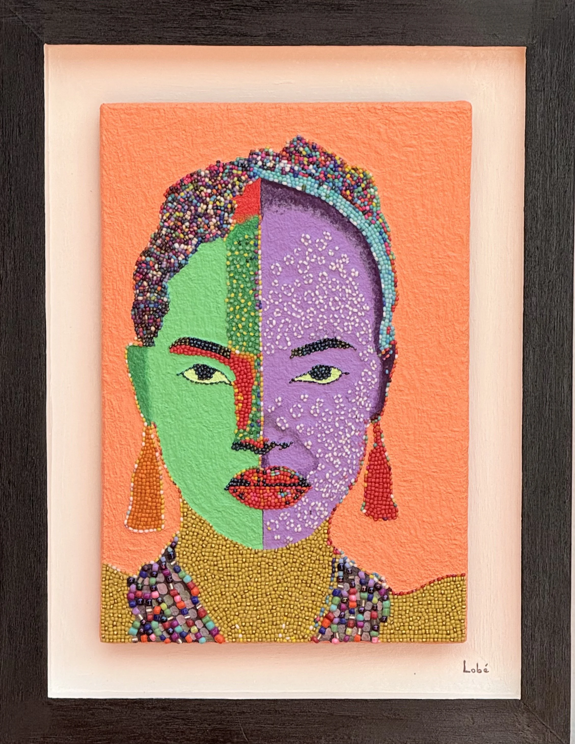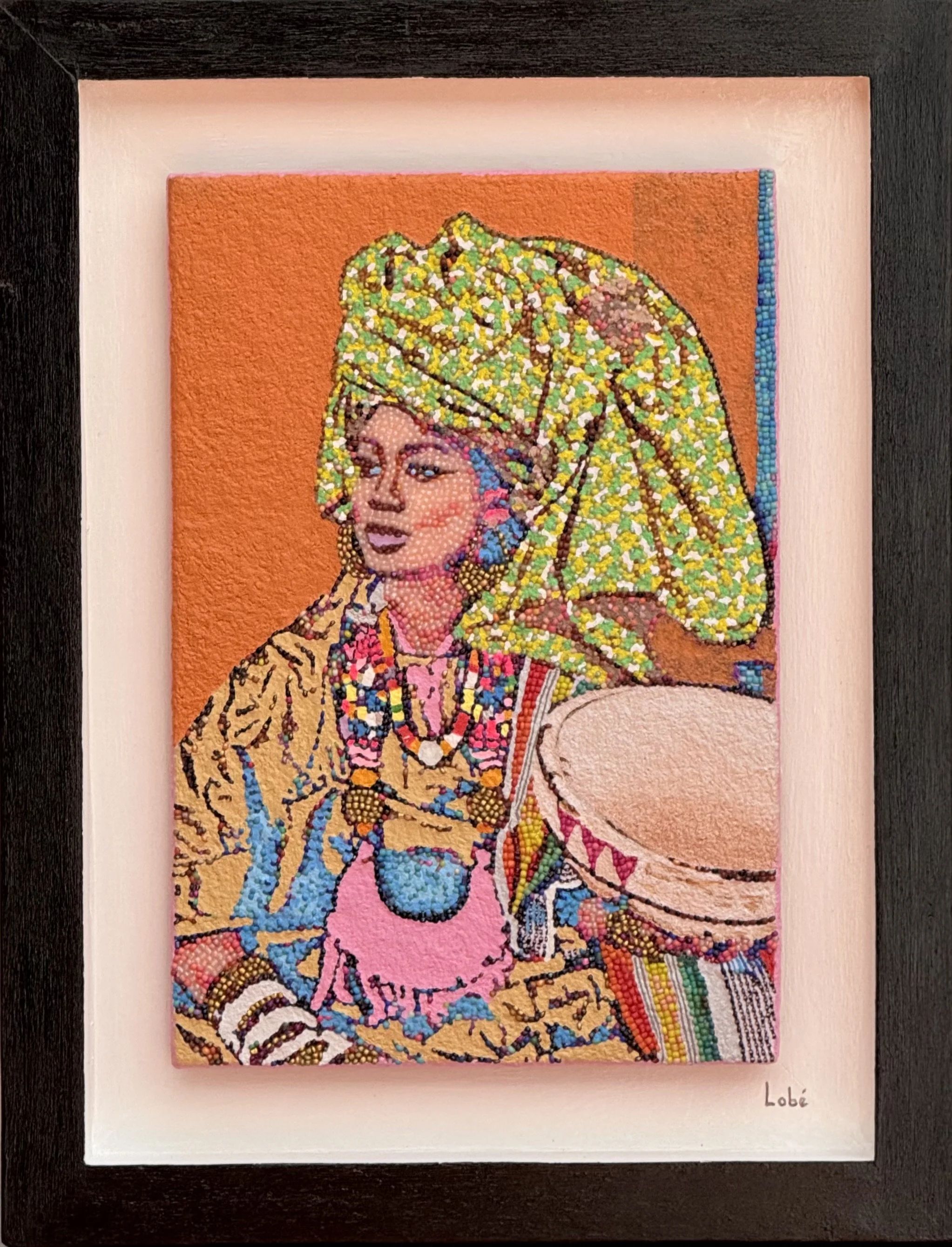 Lobé NDAO is a visual artist born in Dakar and a graduate of the National School of Arts. Her originality lies in her use of a mixed technique based on beads of different sizes and colors. To achieve this, she uses collage and weaving as her working methods.
