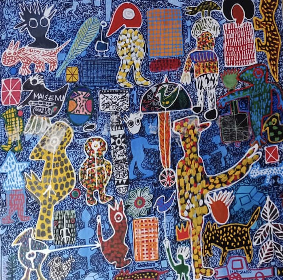 Fascinated by the work of the numerous billboard painters who lived in his busy Dakar neighborhood, Saadio was drawn to painting at a young age. He quit school in his teenage years to work a variety of jobs including tile layer, house painter, shoemaker, trash collector and waiter until, by a twist of fate, he was hired as a telephone operator in a company located across from the studio of famous artist Kalidou Kassé, also known as le Pinceau du Sahel (“the paintbrush of the Sahel”). Saadio started training there before joining the studio of Kre Mbaye on the island of N’gor. In 2006, after 15 years of artistic practice, he had an epiphanic encounter with Jean-Michel Basquiat that revolutionized his approach: he suddenly noticed the vivid graffiti all around him and embraced it, transforming his art.