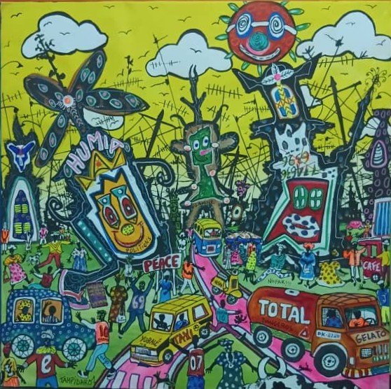 Drawing from everyday imagery — photographs, advertising, crowds, and both urban and natural landscapes — TAMPIDARO composes chimerical scenes infused with poetry, surrealism, and avant-garde boldness. His vibrant, narrative work reflects a sensitive observation of the world and an unapologetic formal freedom. Since 2016, he has exhibited regularly in Dakar and internationally, notably at Dak’Art OFF (2016, 2018, 2022), Le Cube (Dakar, 2022), and most recently at What Art Can Do in Amsterdam (2025). His solo exhibitions, from Dakar to the Wallonia-Brussels Delegation (2023), including Chez Lulu (2020) and Maison de Nadia (2022), confirm a singular journey deeply rooted in material, imagination, and lived experience.